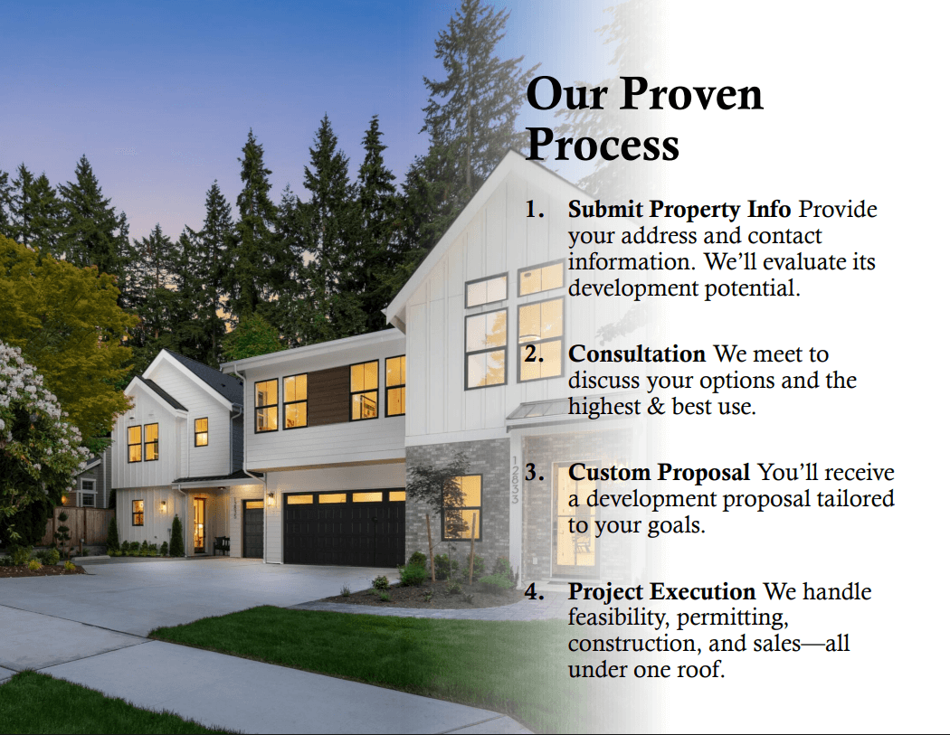 XB Homes provides phased development services designed to maximize value for the property owner—without taking any ownership of the property. You keep full control and profits; we operate as your developer for hire.