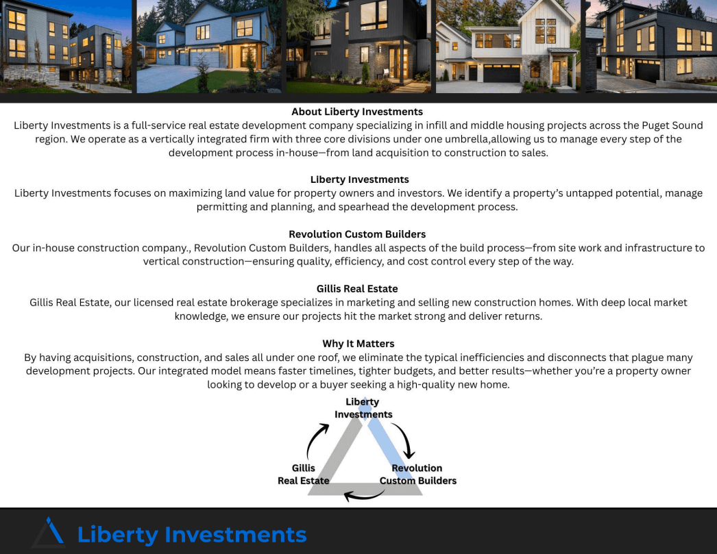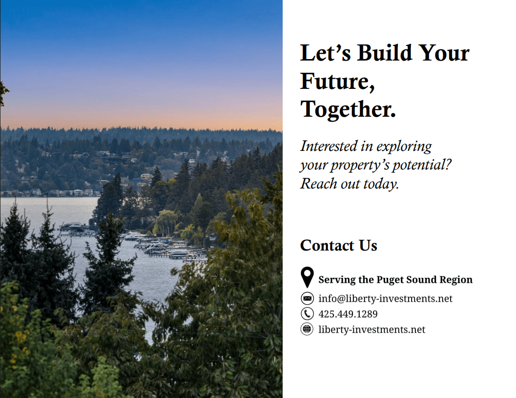 With over 30 years of combined experience in land development, construction, and real estate, Liberty helps property owners capitalize on these changes—whether you want to sell, build for profit, or create long-term rentals.